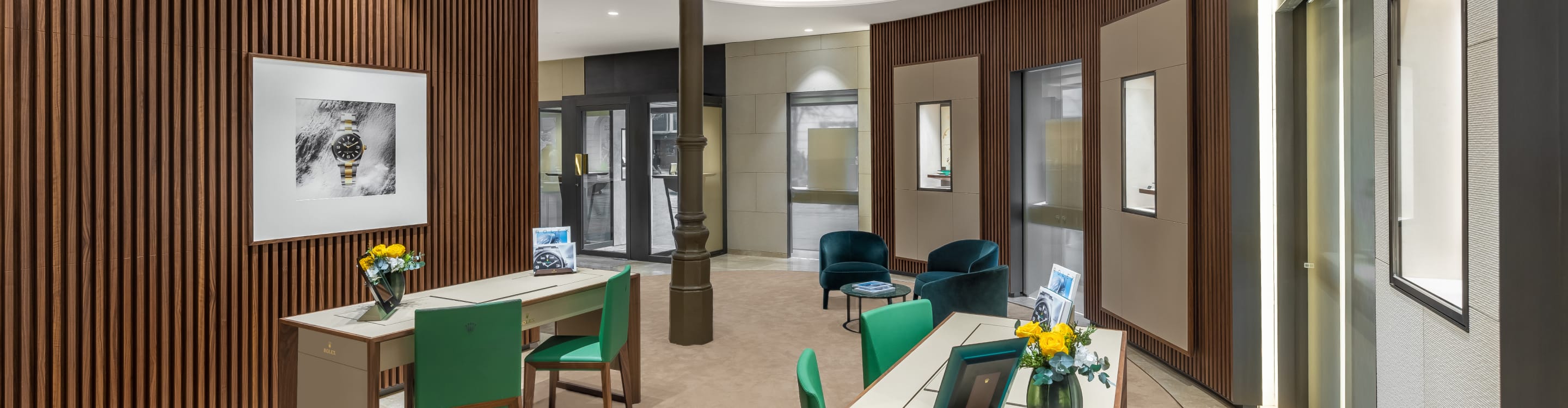 From the outside of the Boutique Rolex, you can discover some of the aesthetic codes of the Swiss brand such as the large green panel that marks the center of the boutique and welcomes you to the Rolex Universe.